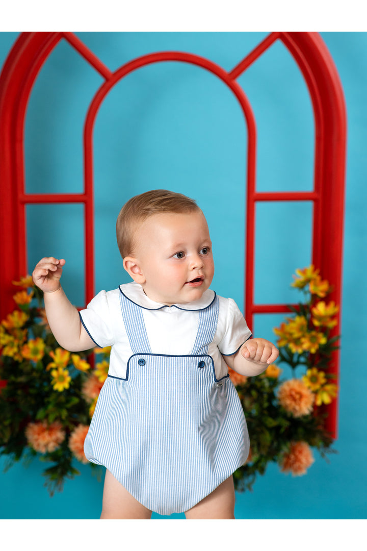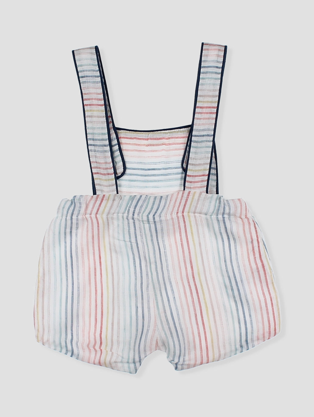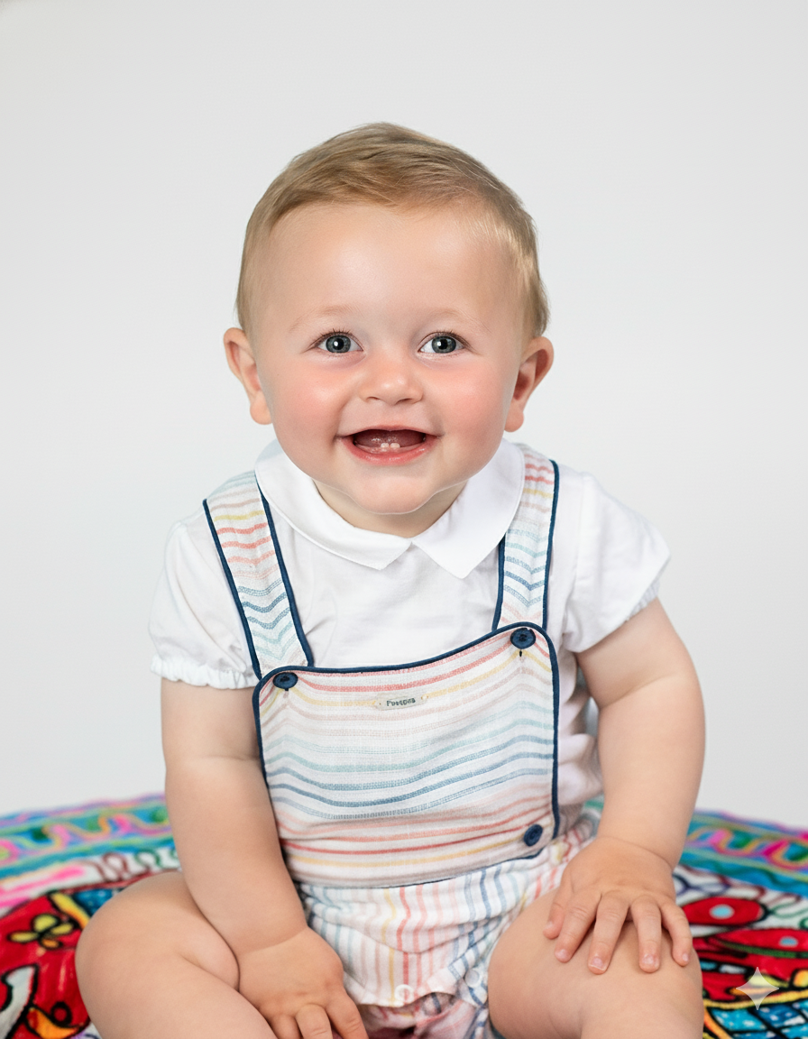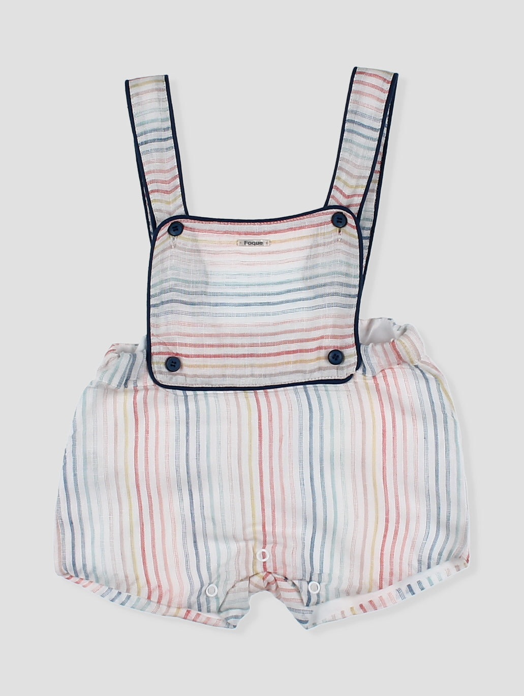 Ranita bebé con tirantes y diseño a rayas multicolor. Los detalles en contraste con ribete azul y los botones decorativos añaden un toque de estilo. Incluye prácticos broches en la entrepierna para facilitar el cambio. Confeccionado en tejido ligero y fresco, perfecto para los días de verano. Una prenda imprescindible para mantener a tu pequeño cómodo y a la moda. pónsela sola o cambinada con la blusa básica blanca