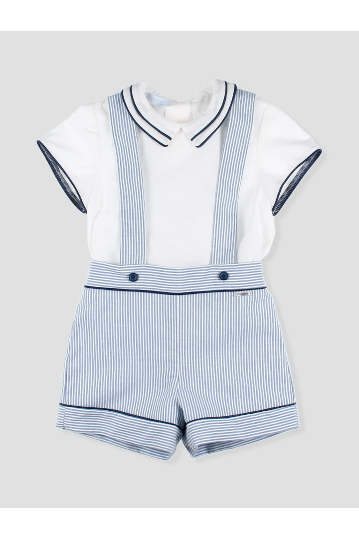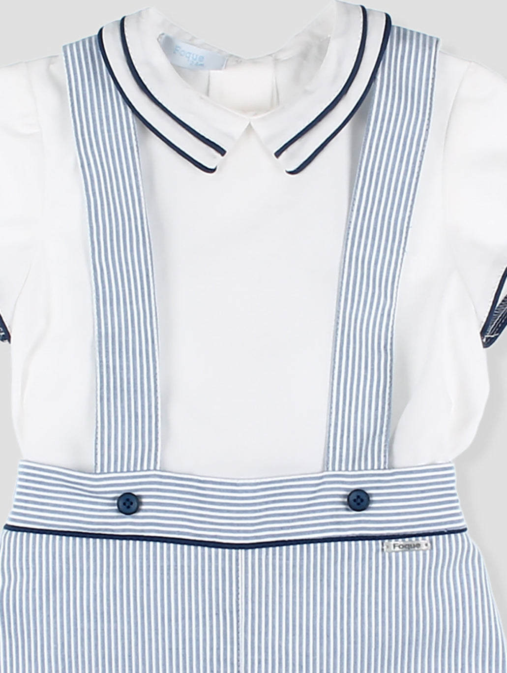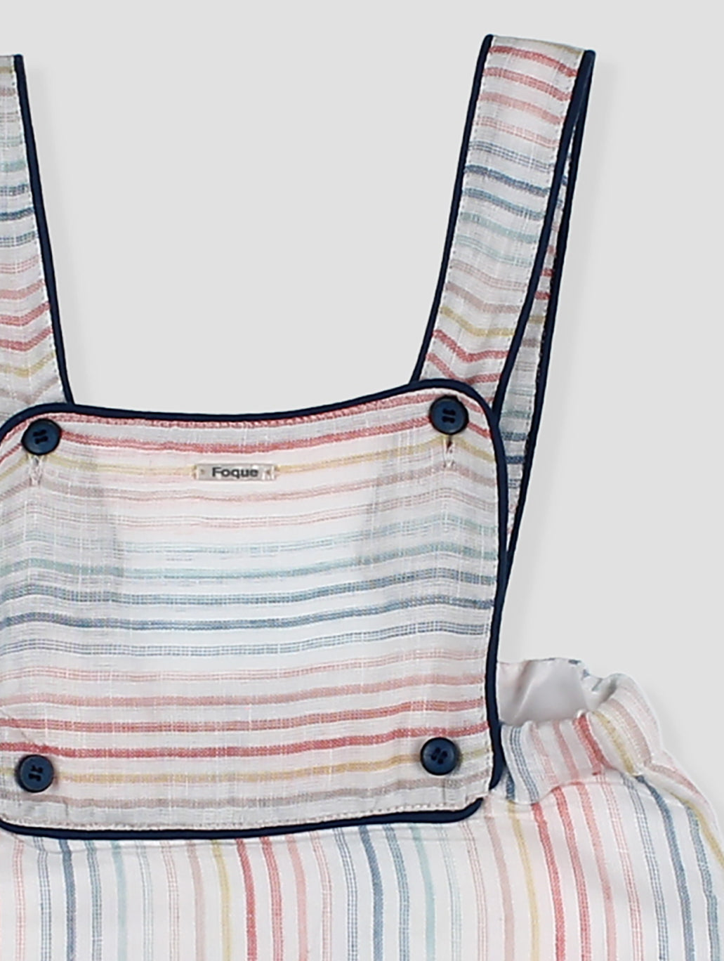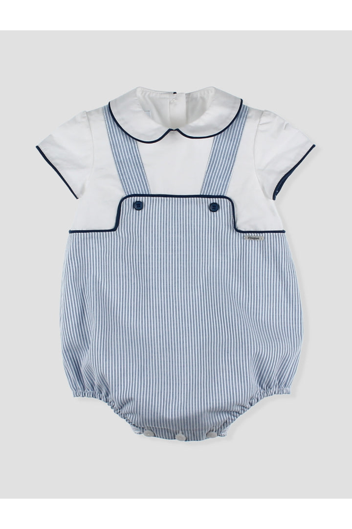 Ranita bebé con tirantes y diseño a rayas multicolor. Los detalles en contraste con ribete azul y los botones decorativos añaden un toque de estilo. Incluye prácticos broches en la entrepierna para facilitar el cambio. Confeccionado en tejido ligero y fresco, perfecto para los días de verano. Una prenda imprescindible para mantener a tu pequeño cómodo y a la moda. pónsela sola o cambinada con la blusa básica blanca