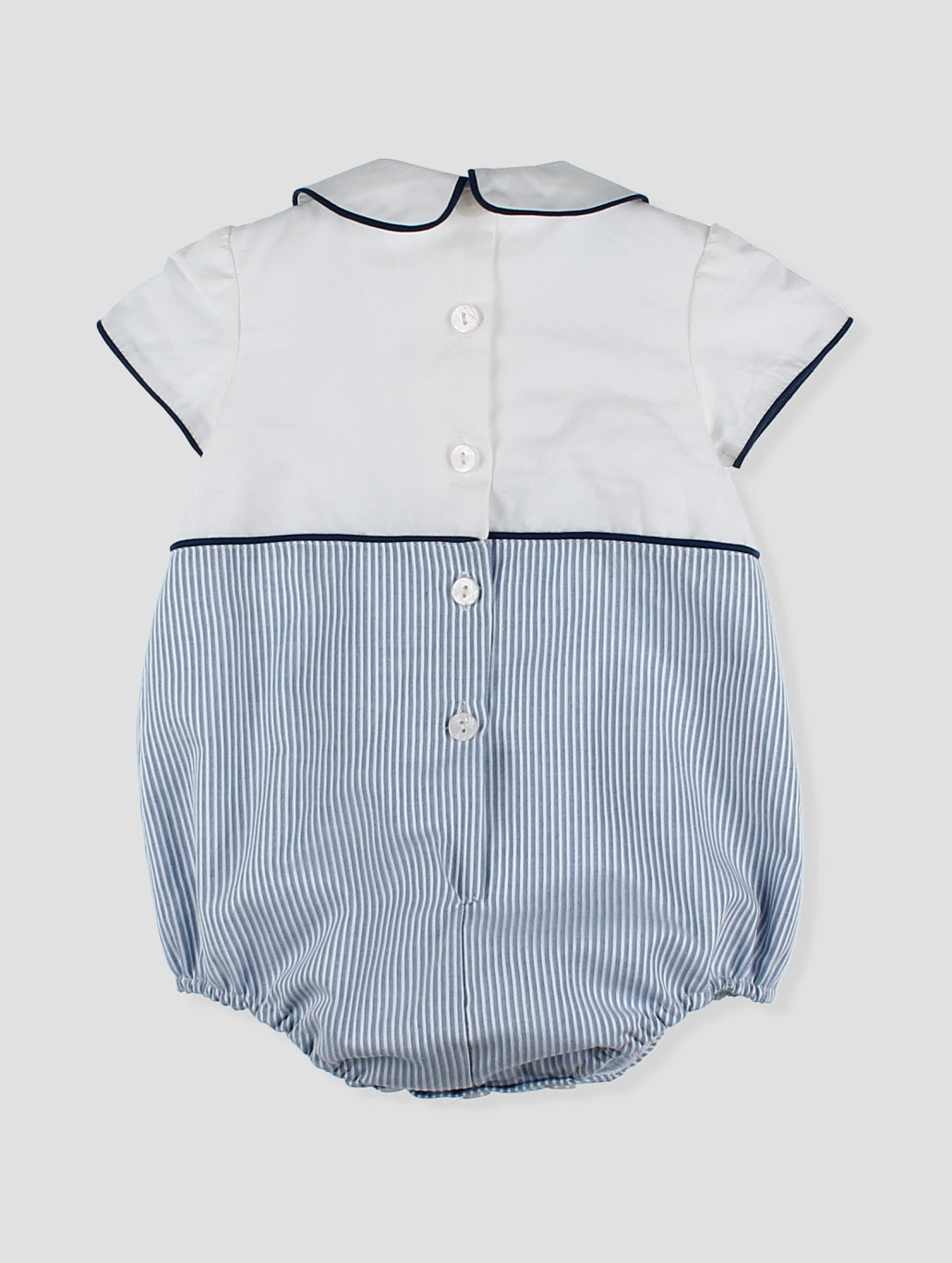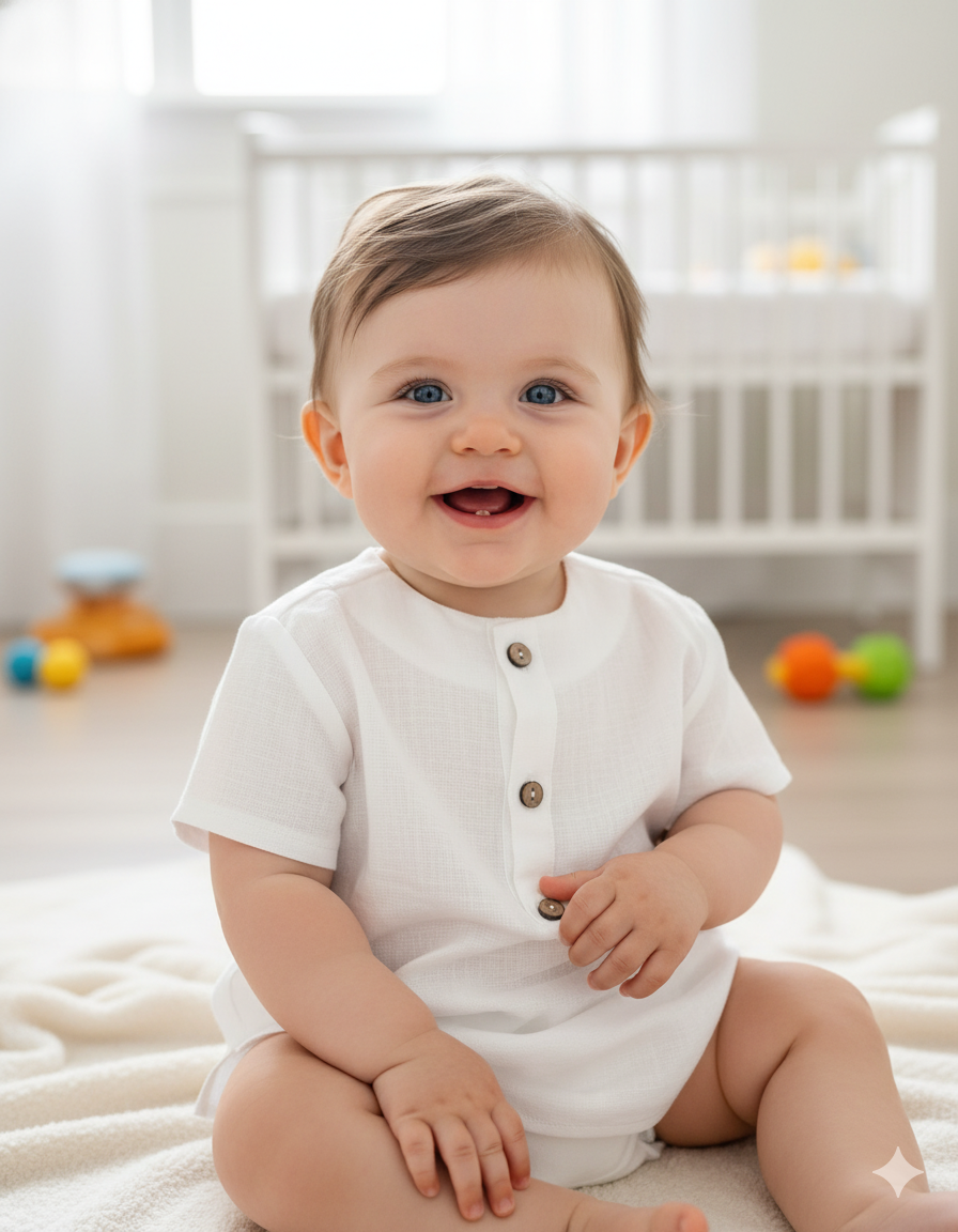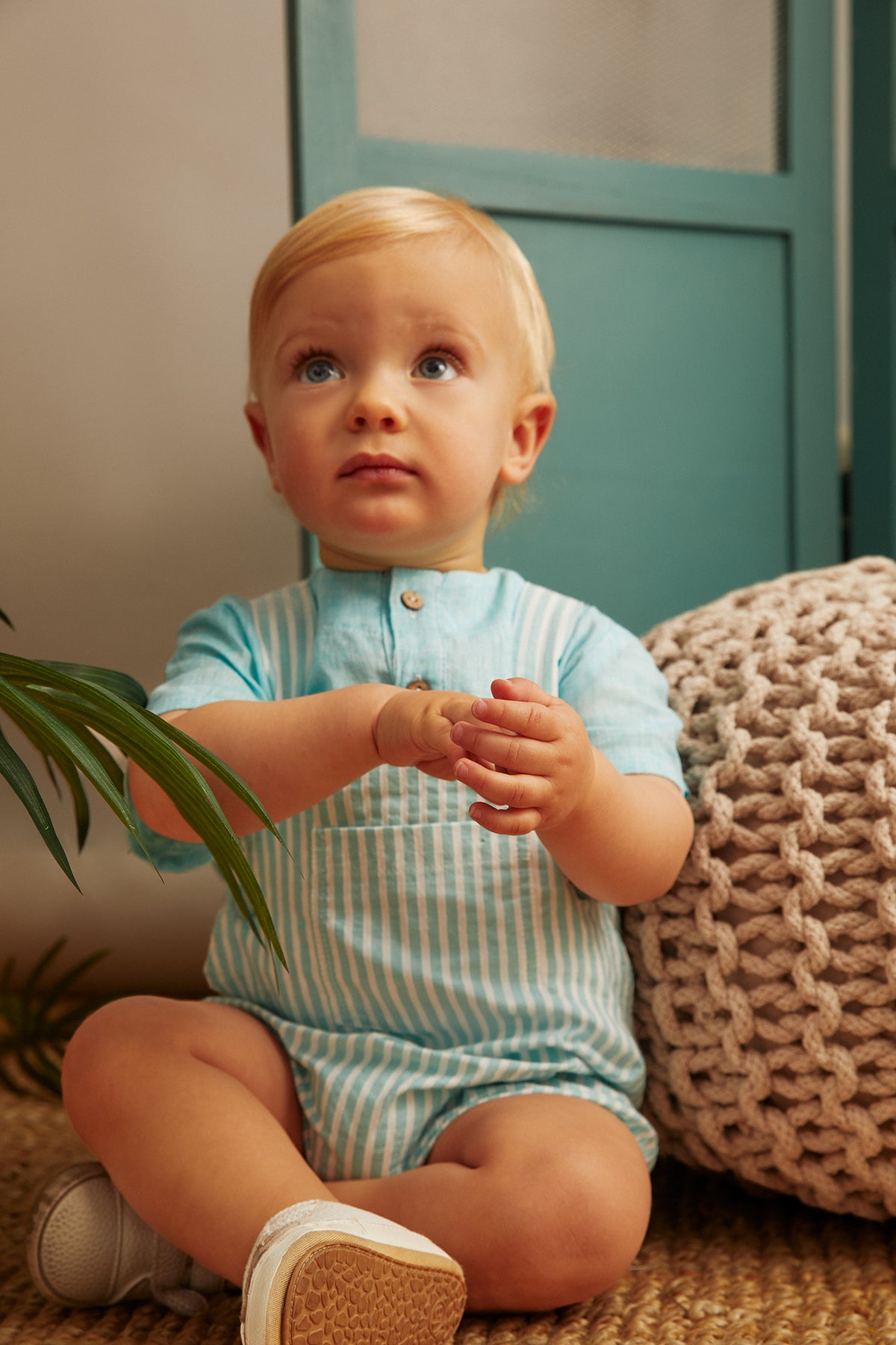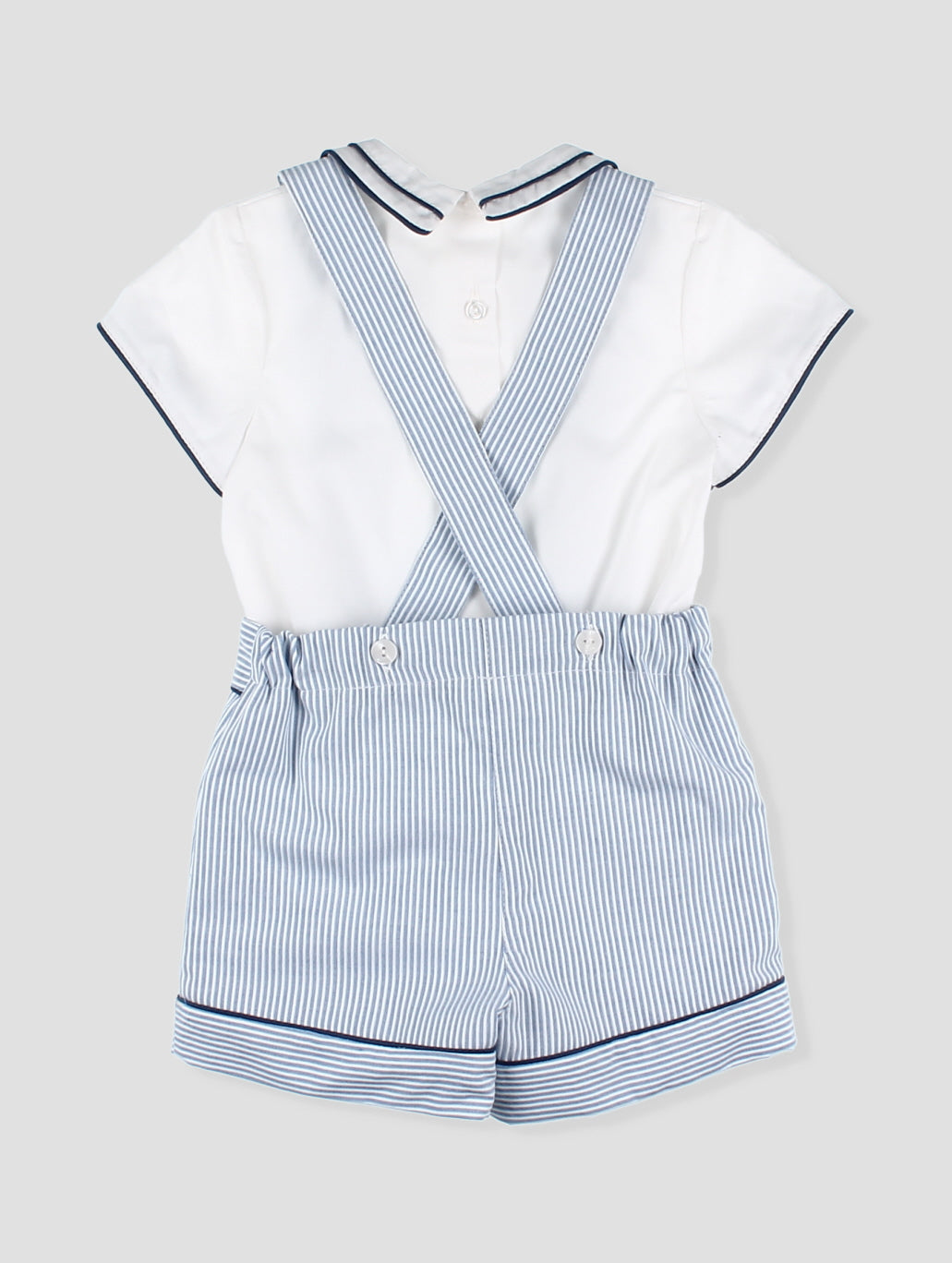 Ranita bebé con tirantes y diseño a rayas multicolor. Los detalles en contraste con ribete azul y los botones decorativos añaden un toque de estilo. Incluye prácticos broches en la entrepierna para facilitar el cambio. Confeccionado en tejido ligero y fresco, perfecto para los días de verano. Una prenda imprescindible para mantener a tu pequeño cómodo y a la moda. pónsela sola o cambinada con la blusa básica blanca