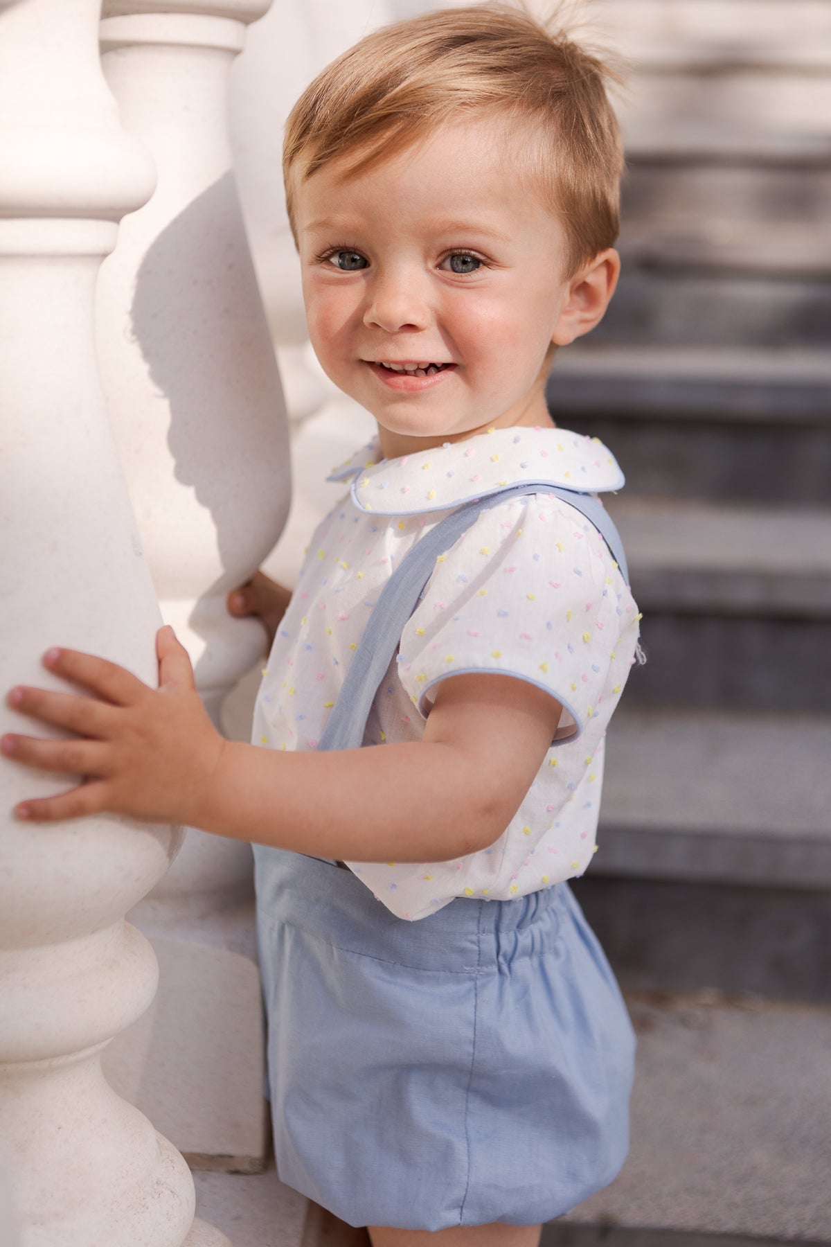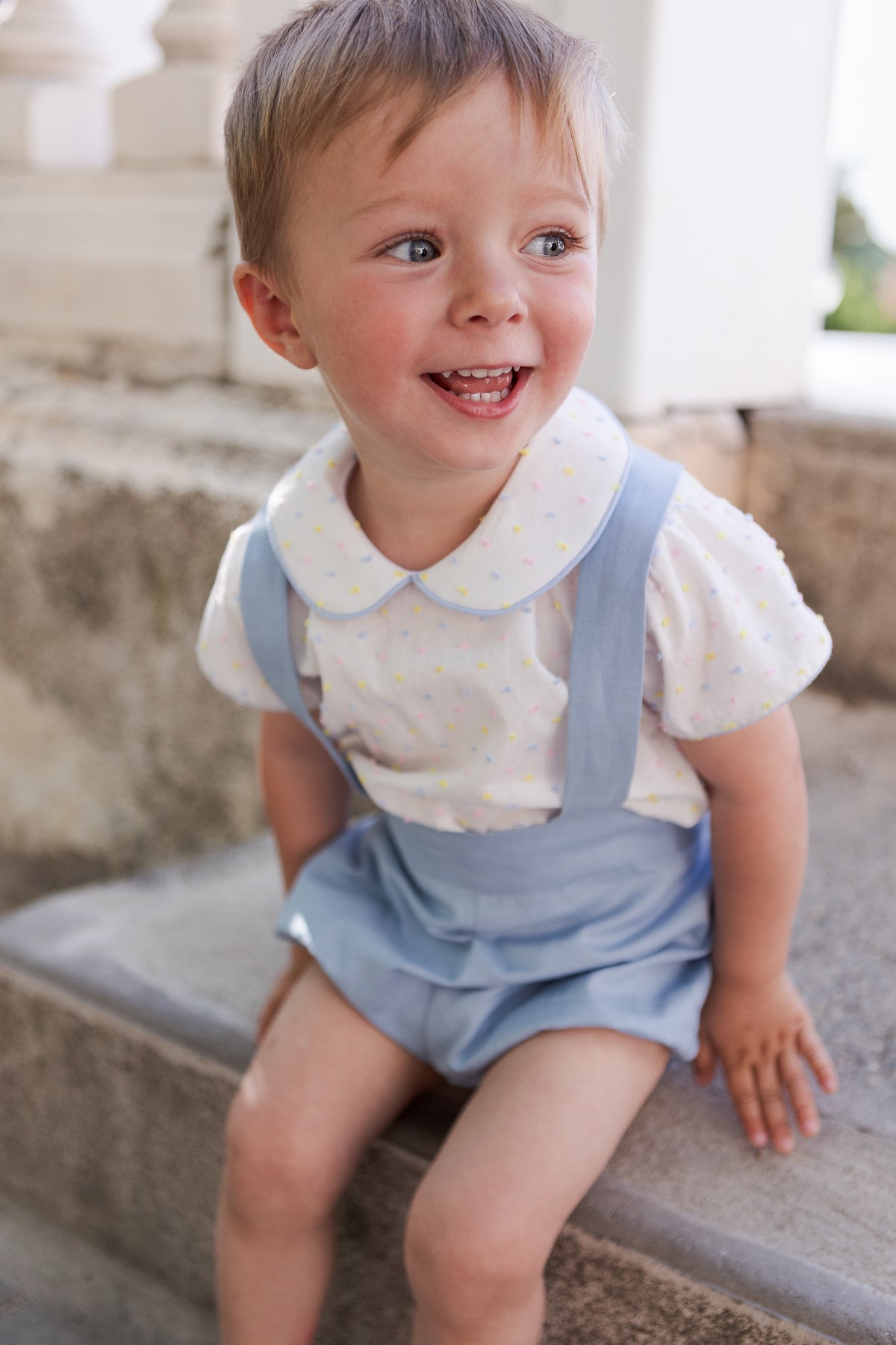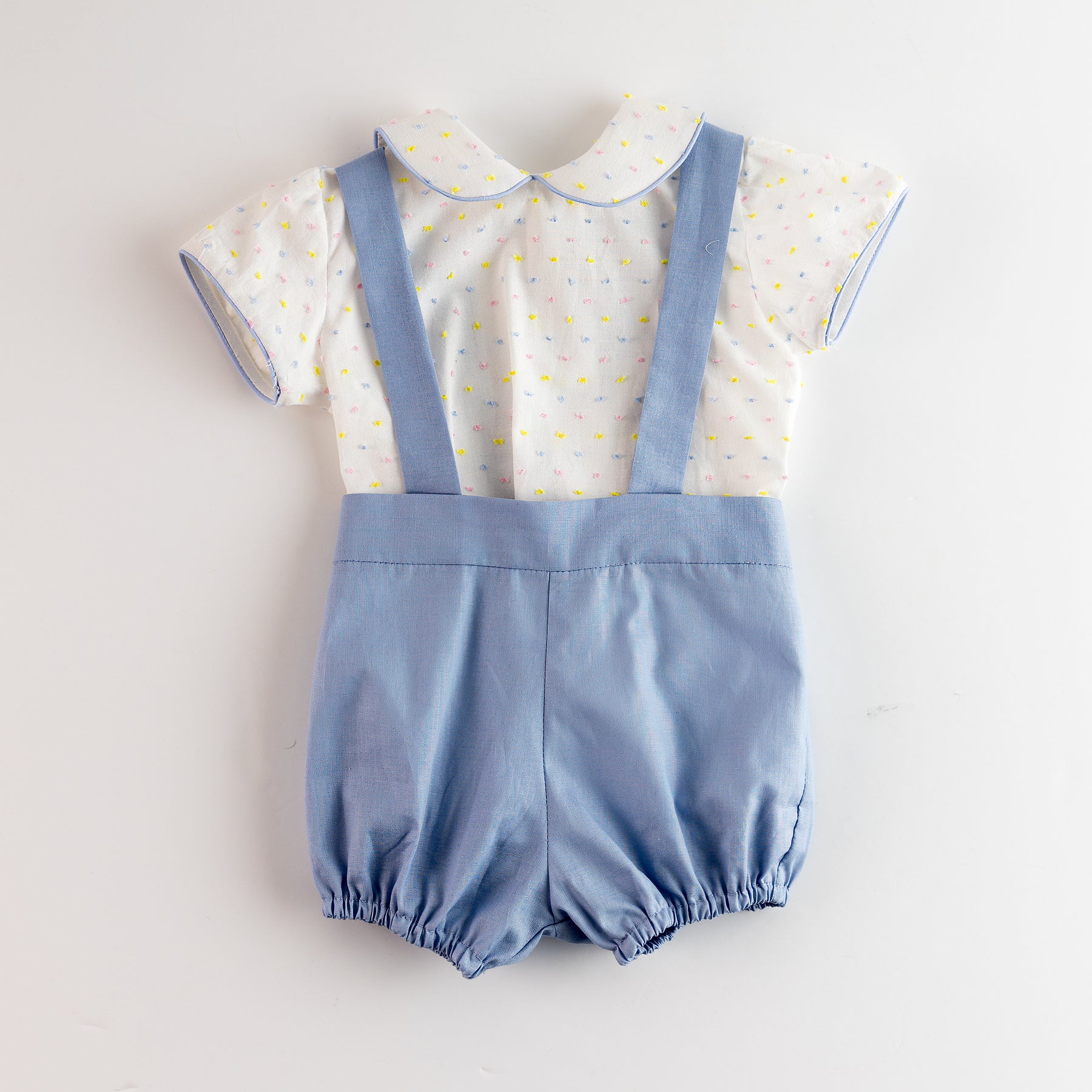 Precioso conjunto para bebé niño fabricado en España. Bombacho con tirantes en celeste pastel y camisa manga corta de plumeti con celestes con amarillo muy delicados y en tendencia. Ribete celeste a contraste en mangas y cuello. Opción super fresca para que tu bebé luzca como un pequeño principito.