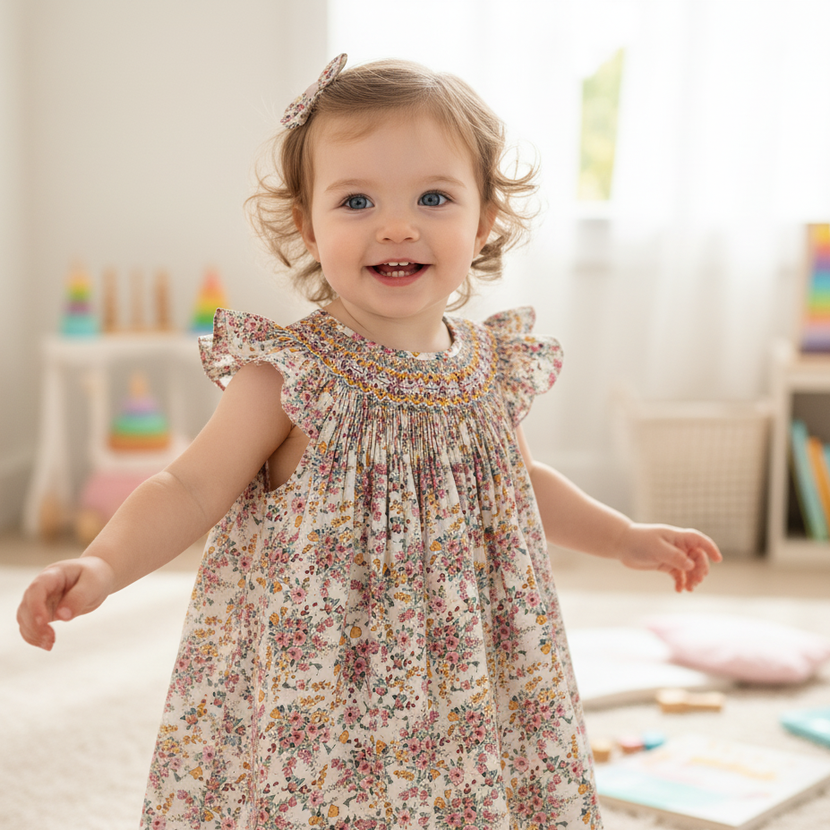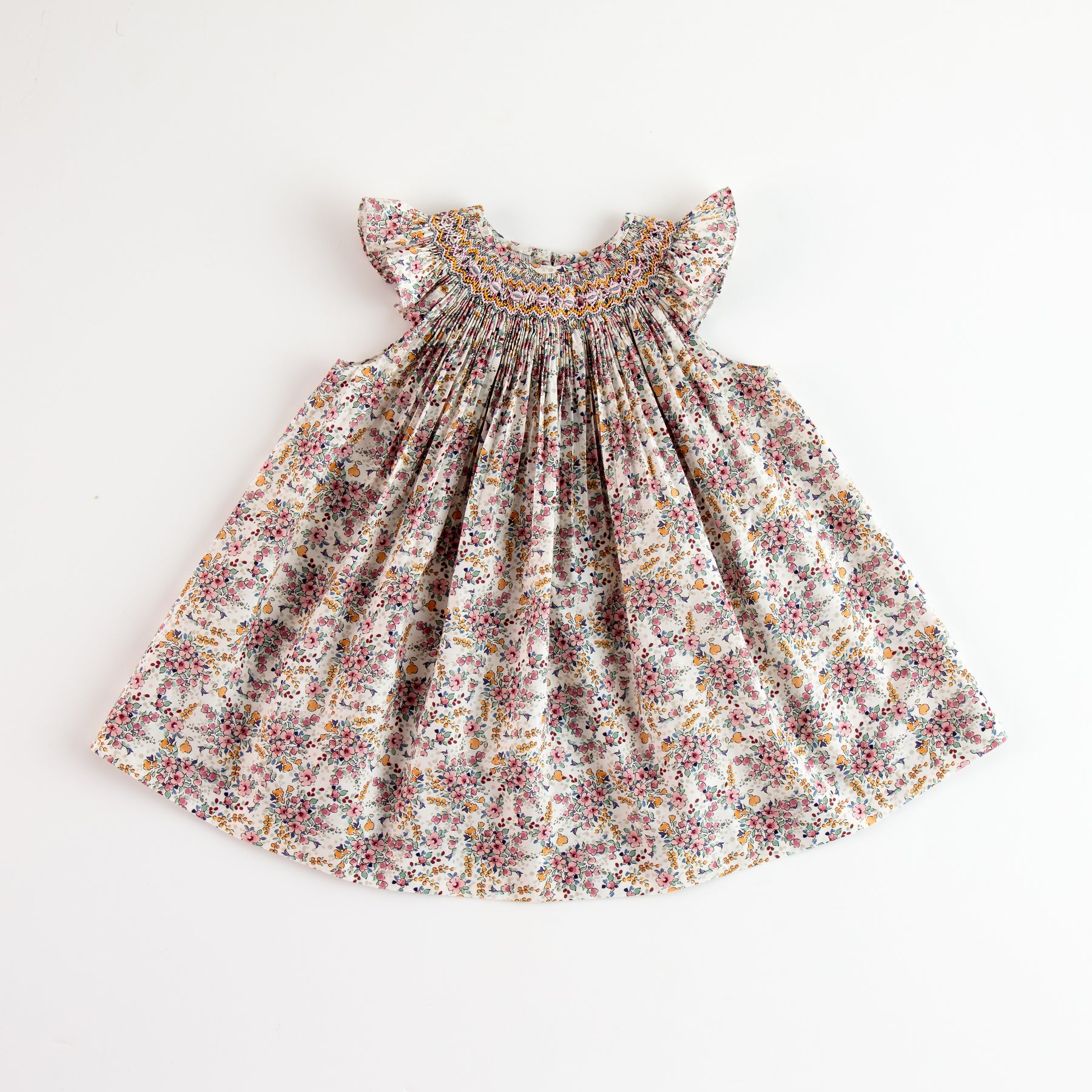 Precioso vestido de niña, fabricado en España con tela exclusiva de Liberty London. El vestido tiene un detalle de bordado punto smock la pechera delantera con msnga aleta perfecto para el verano. Opción de lazo a juego adicional