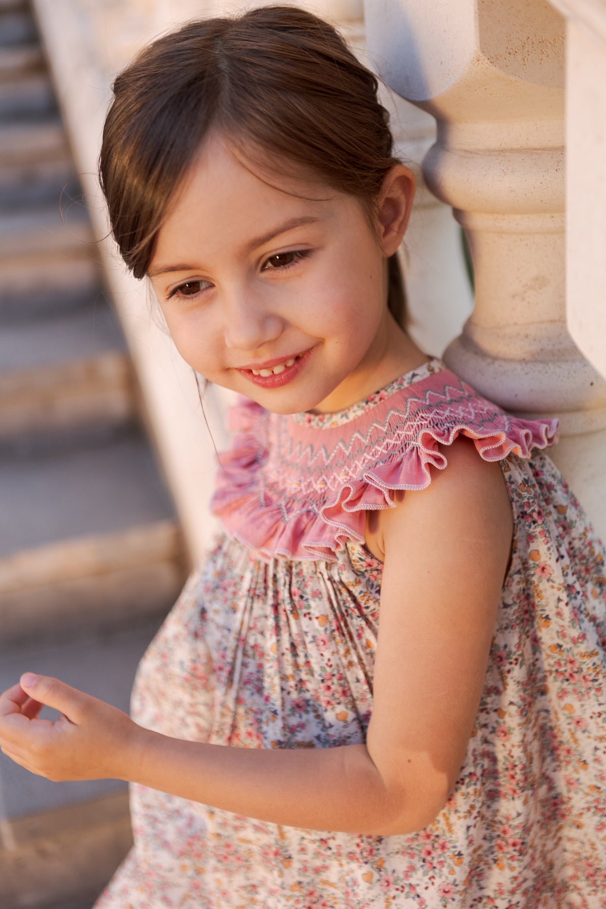 Precioso vestido de niña, fabricado en España con tela exclusiva de Liberty London. El vestido tiene un detalle de bordado punto smock en todo el cuello volante a contraste. Opción de lazo a juego adicional